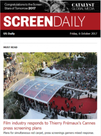 Unlimited online access to Screendaily.com Digital editions of Screen magazine Digital festival & market dailies Breaking news emails & newsletters